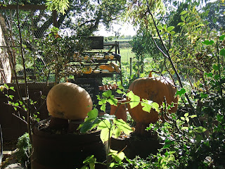 We headed down towards Kings Grove where we stopped to find a cache and then walked across the fields towards Commonside. We had to walk down a narrow lane and passed a small Market garden shop which had a lovely display of Autumn vegetables.